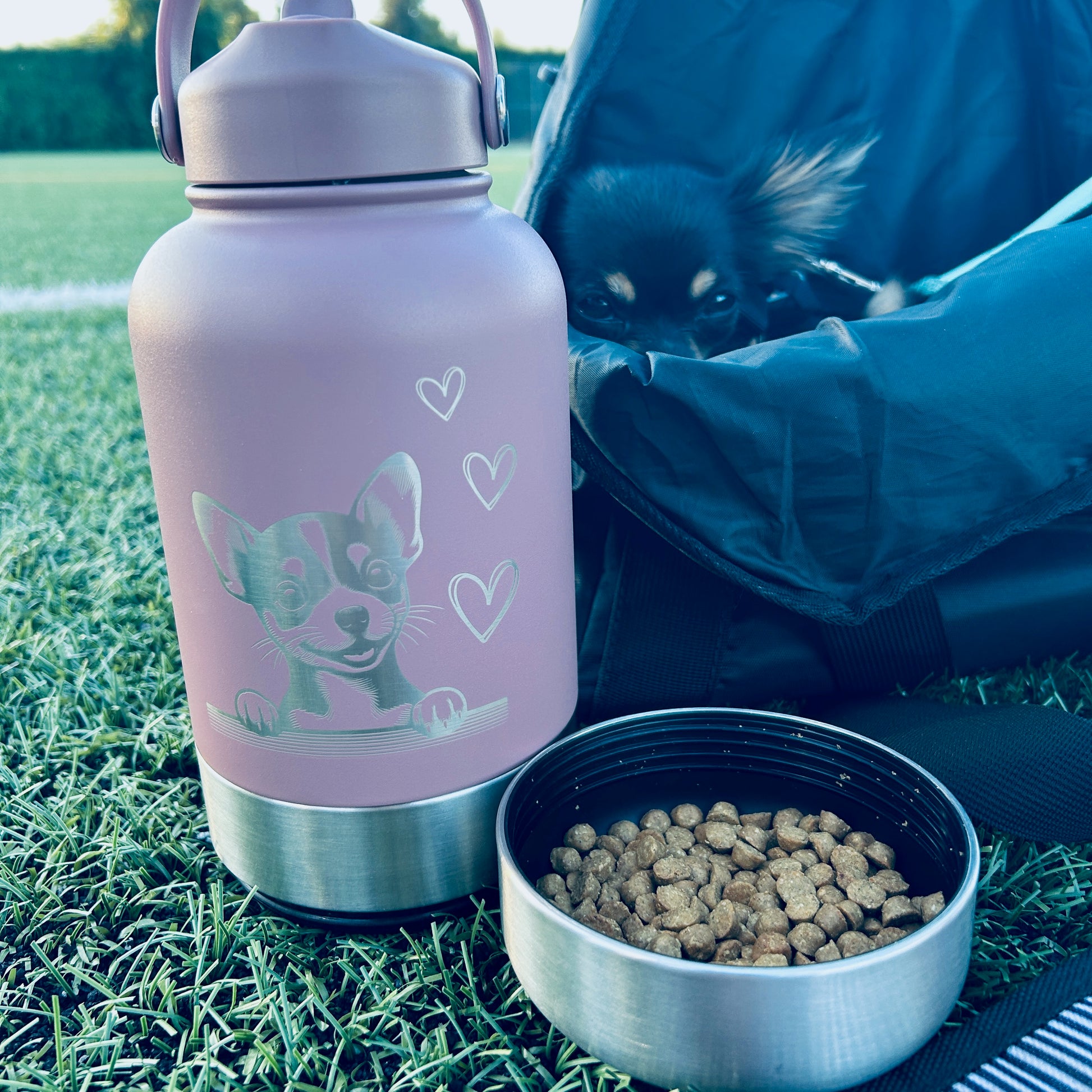 Découvrez nos bouteilles personnalisables ultra pratiques : elles comprennent deux bols intégrés sous la bouteille – un pour l’eau, un pour la nourriture – et une bouteille isotherme pour vous.