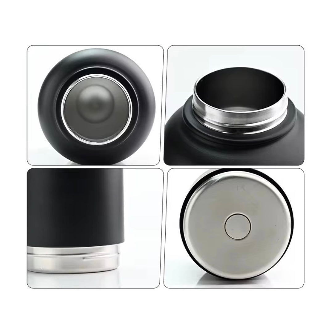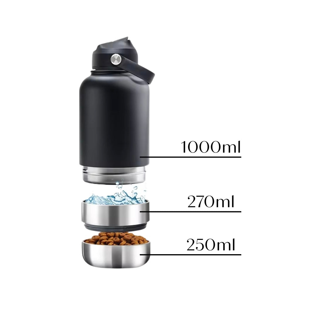 Découvrez nos bouteilles personnalisables ultra pratiques : elles comprennent deux bols intégrés sous la bouteille – un pour l’eau, un pour la nourriture – et une bouteille isotherme pour vous.
