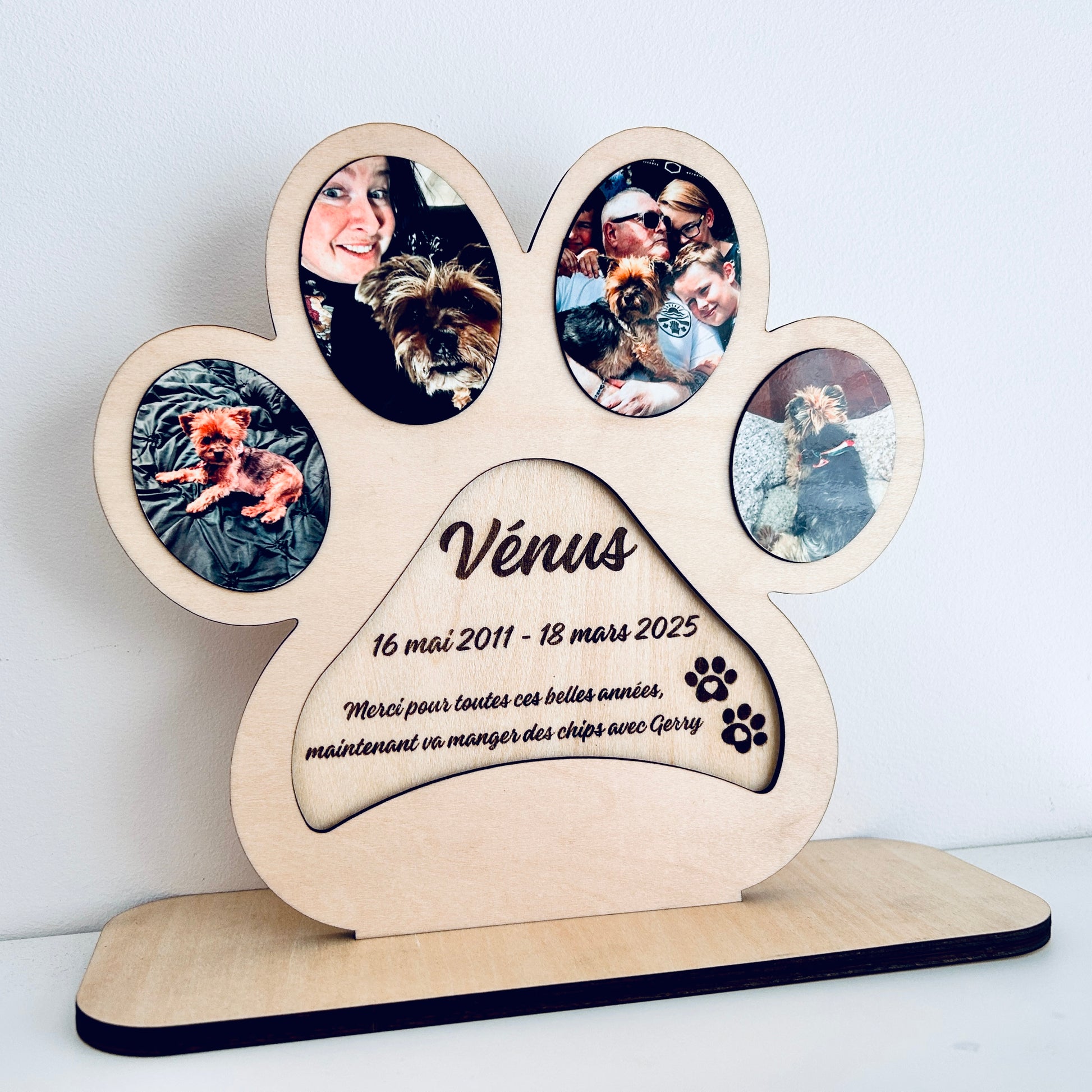 Créé avec soin au Québec, notre cadre en bois en forme de patte est une façon unique et chaleureuse d’honorer la mémoire de votre fidèle compagnon. Il peut contenir quatre photos que vous nous ferez parvenir, accompagnées de son nom, sa date de naissance et de décès, ainsi qu’une phrase personnalisée choisie par vous.